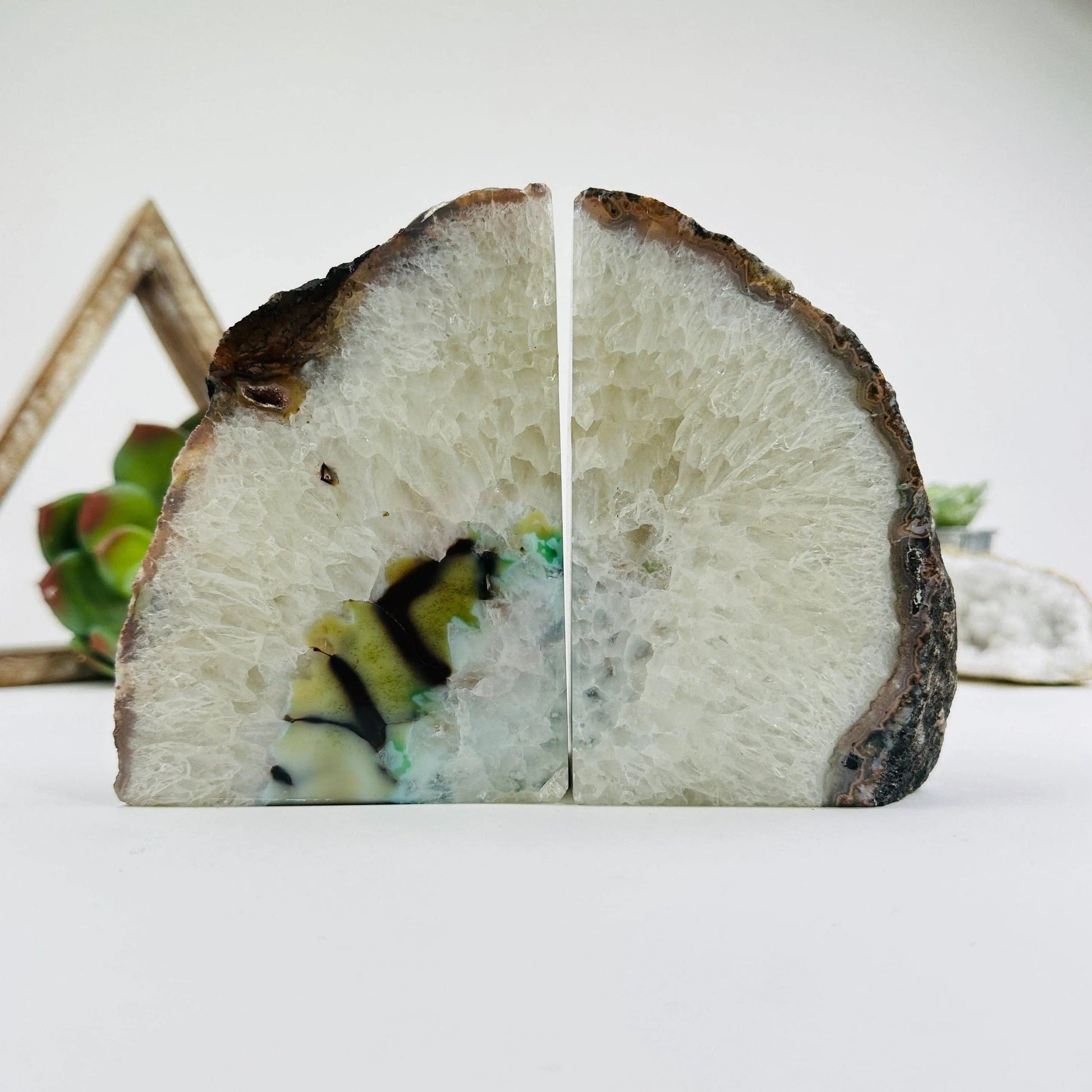 Agate geodes are ancient rocks formed from gas bubbles on past volcanic eruptions or by the dissolution of sedimentary concretions like quicksand over million of years and are known to carry great power within them. Each bookend is cut, and polished by hand in Brazil from rough agate geodes. Each one is hand selected for it's natural beauty from rough material, hand cut in halves, polished and dyed.
