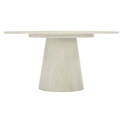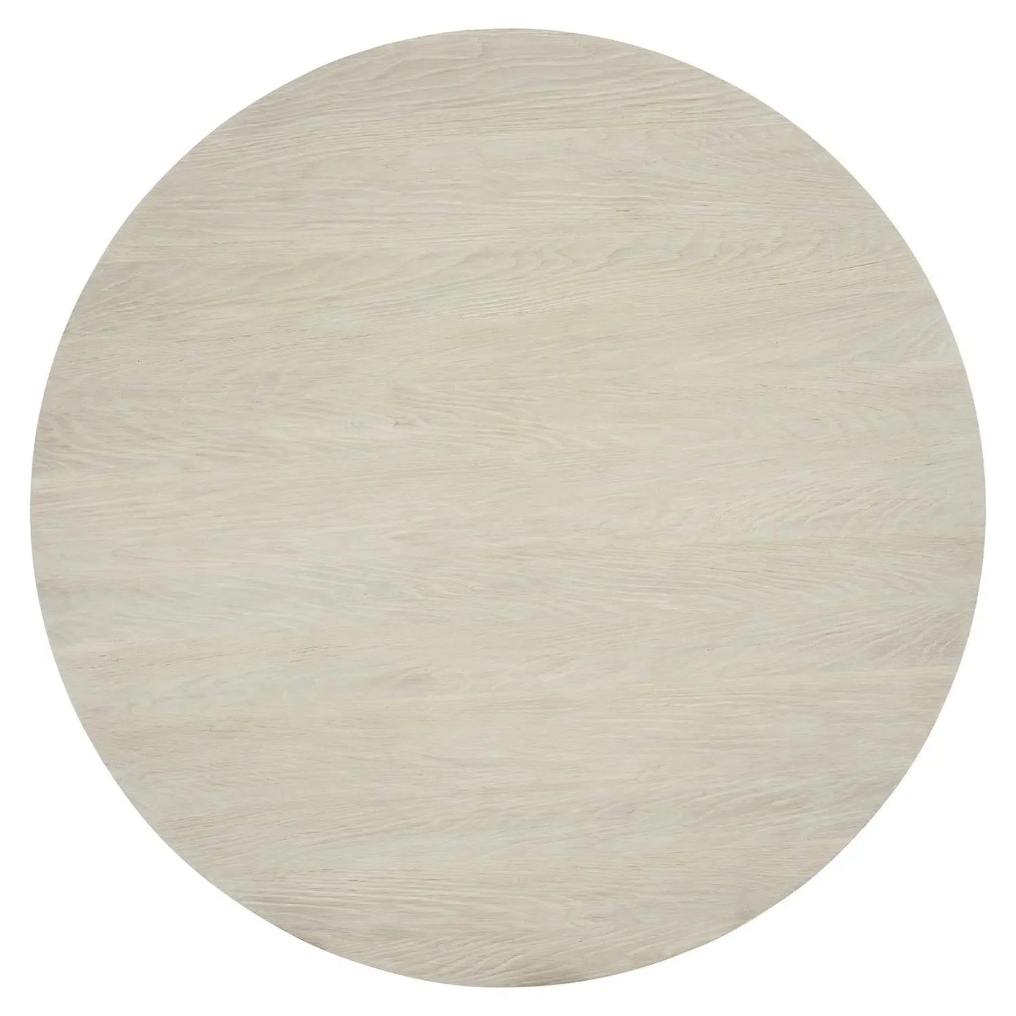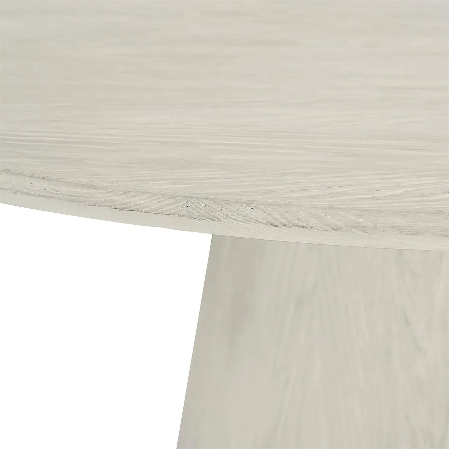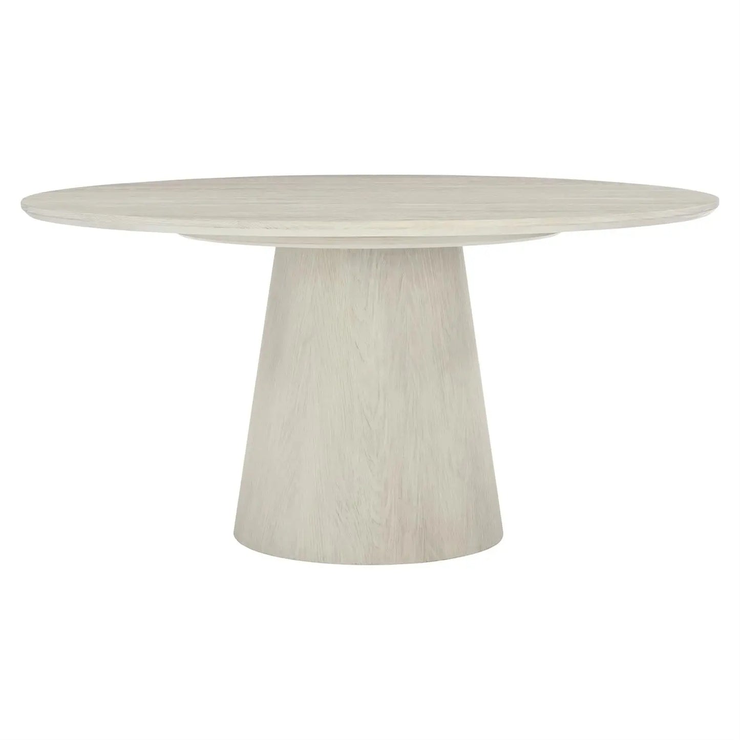 Simple and elegant, the Alexa dining table pairs a round top with a round tapered pedestal for a sculptural, balanced look. Sandblasted white oak veneers in a jicama finish convey an air of casual sophistication with a light, natural feel. Crafted from sandblasted white oak in a jicama finish, this sophisticated modern dining table has a natural and serene look. Dimensions: 60" width, 60" depth, 30" height. Top of sandblasted White Oak in Jicama finish. Round tapered sandblasted Oak table base in Jicama finish. Adjustable glides. Please allow up to 4 weeks for shipping, as lead times are subject to change. This product is final sale and is not eligible for refunds or returns.
