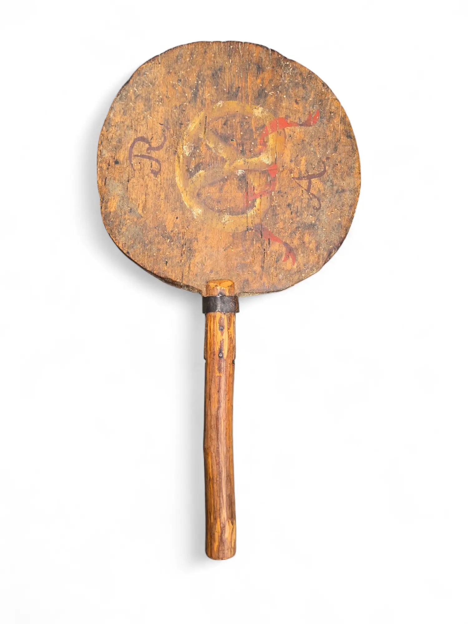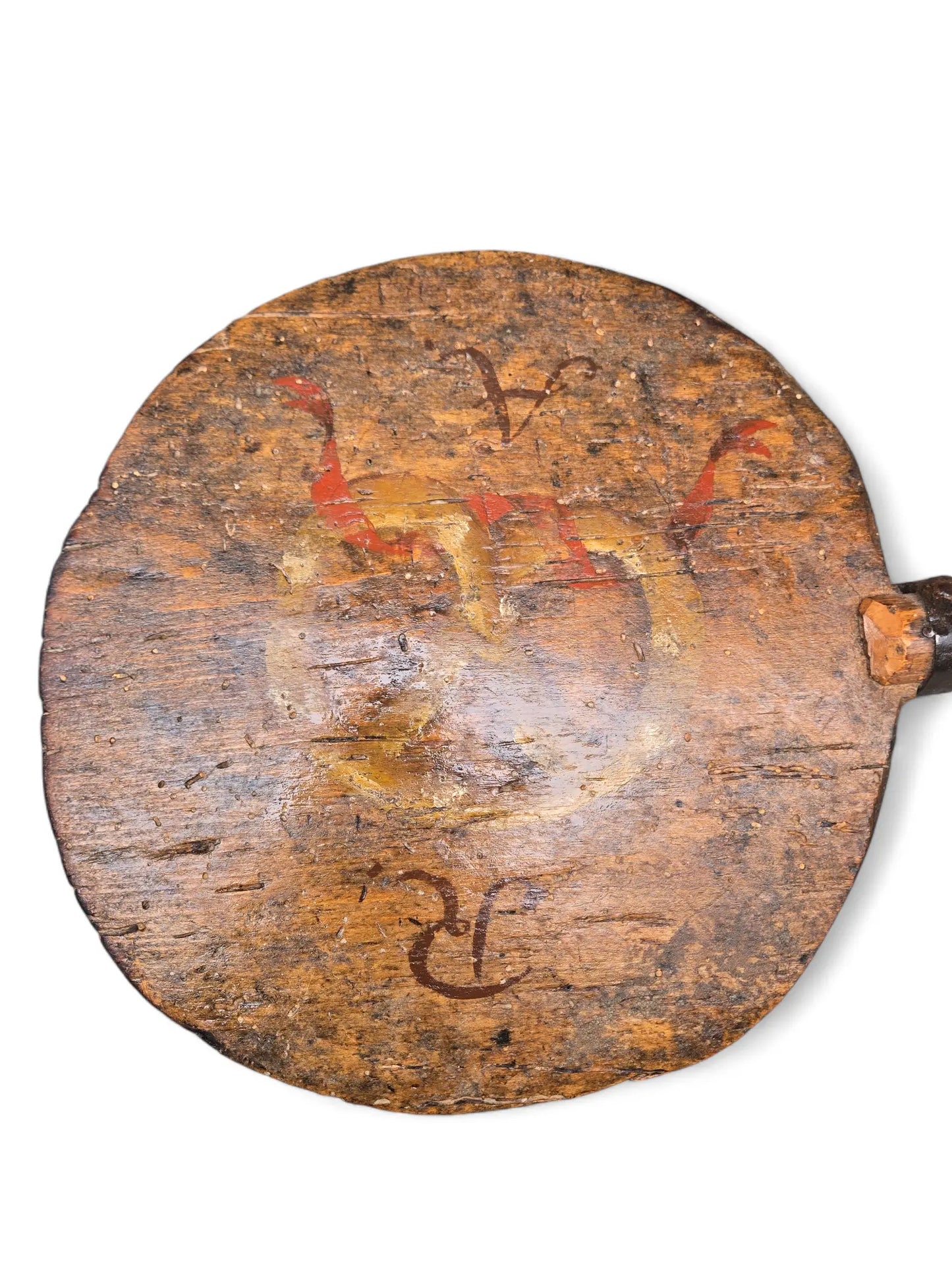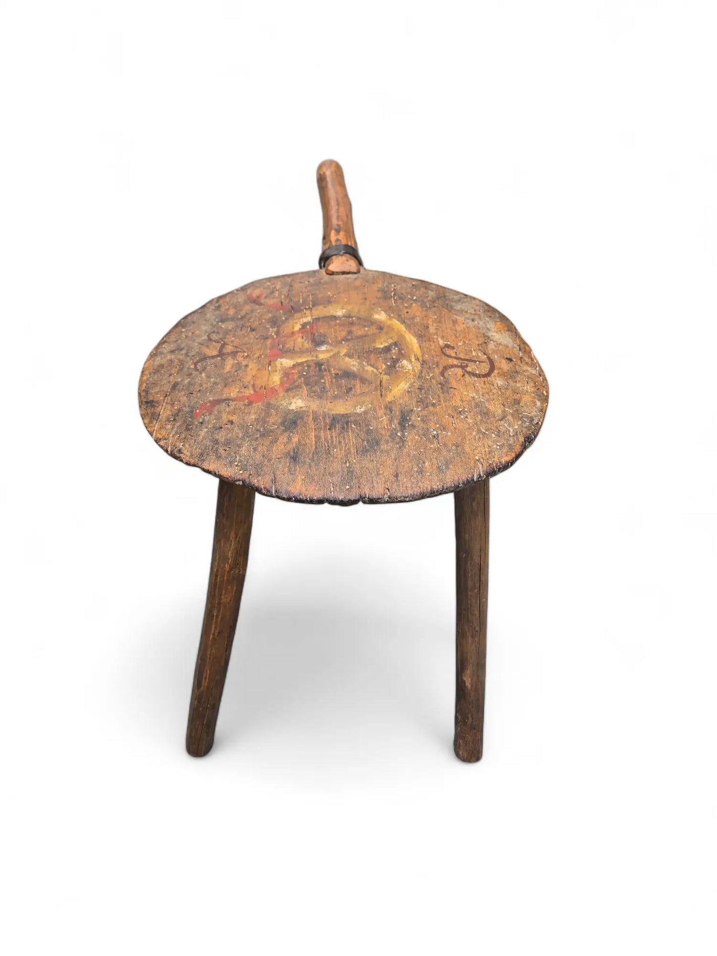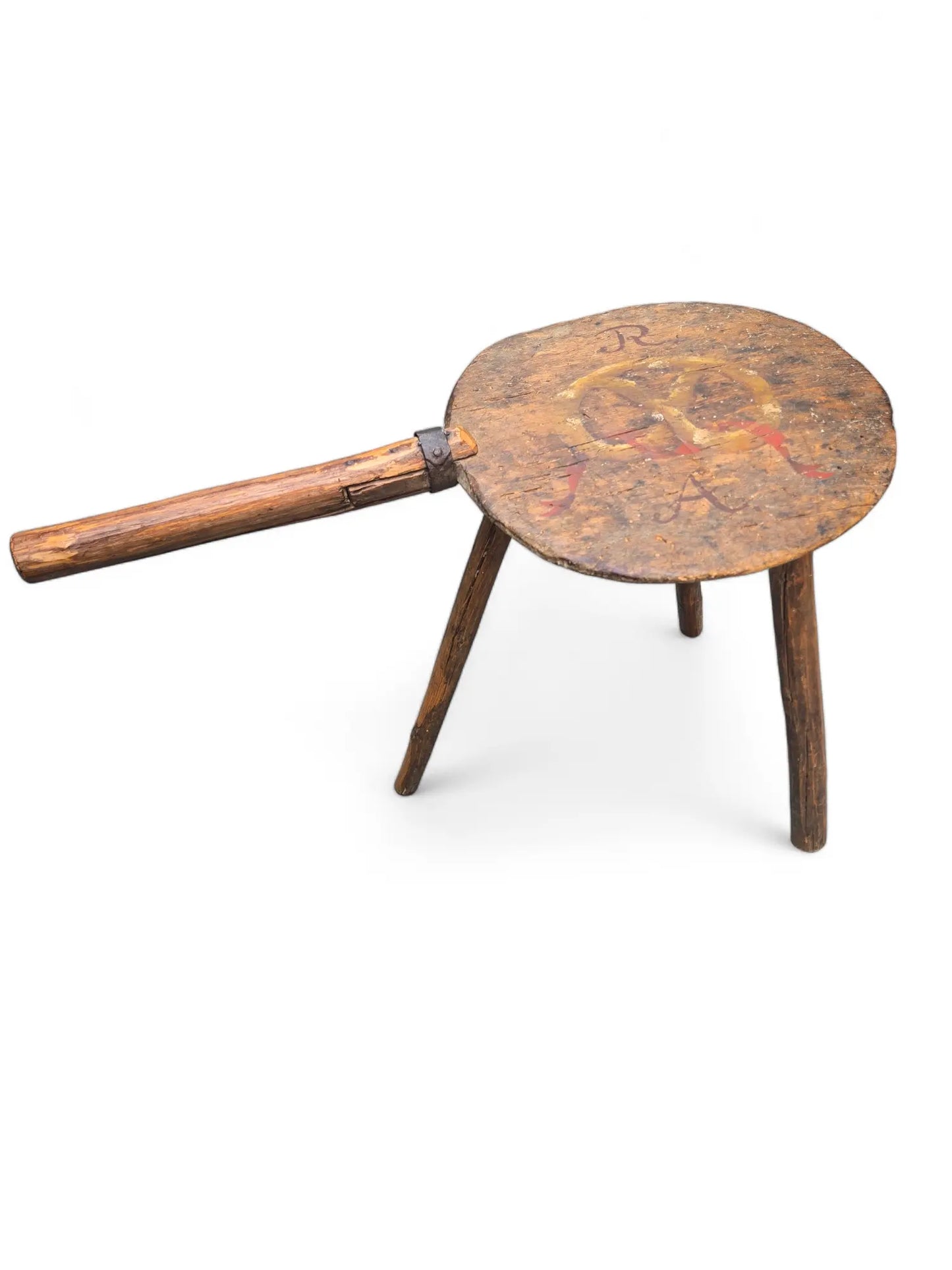 Whimsical antique bread peel , paingted with initials AR fashioned into a milking stool.