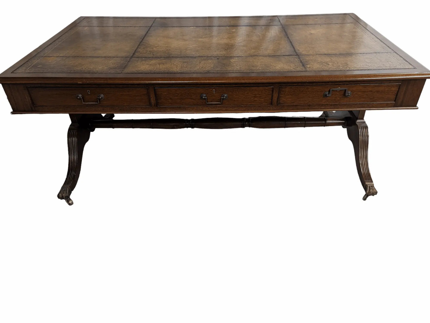 Antique English mahogany leather top desk. Three drawers with trestle and mounted on casters.Circa 1840. Dimensions: Height is 30 inches, width is 72 inches, and depth is 42 inches. Contact us for custom shipping quotes Ships in 2-3 weeks. Please allow 4 weeks for shipping, as shipping rates may change. Refunds and returns are not available.