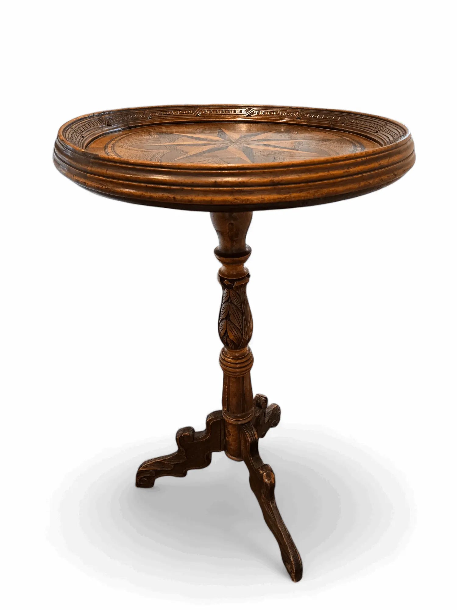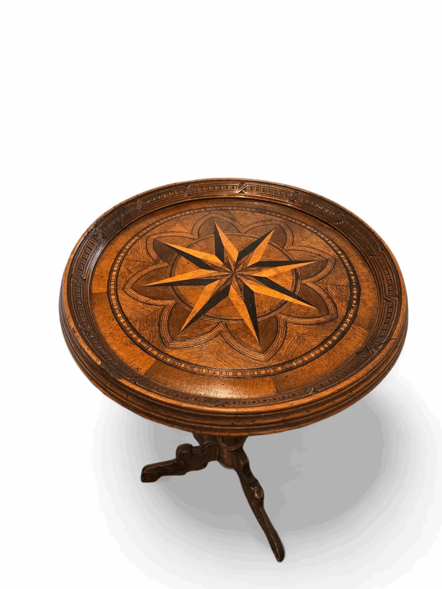 Antique star inlaid walnut pedestal table has beautiful rich patina. Single pedestal carved base. Continental carved table. 19th C.