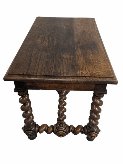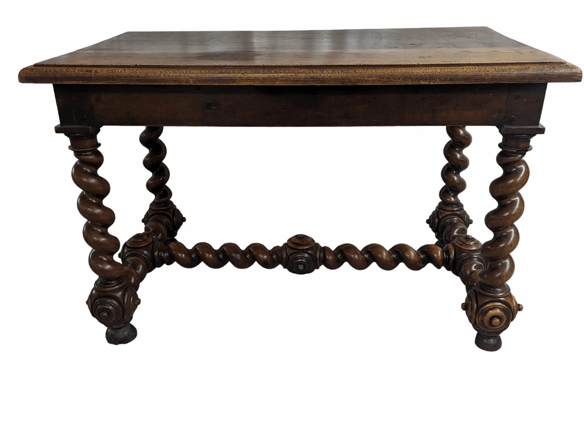 This Antique Turned leg dark fruitwood table features a single drawer and turned stretcher, giving it elegant and timeless appeal. Originating from the year 1860, its dimensions are 47" in width, 27" in depth, and 30" in height.Contact us for custom shipping quotes Ships in 2-3 weeks. Please allow 4 weeks for shipping, as shipping rates may change. Refunds and returns are not available. Contact our customer service team for a custom quote.