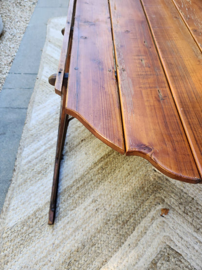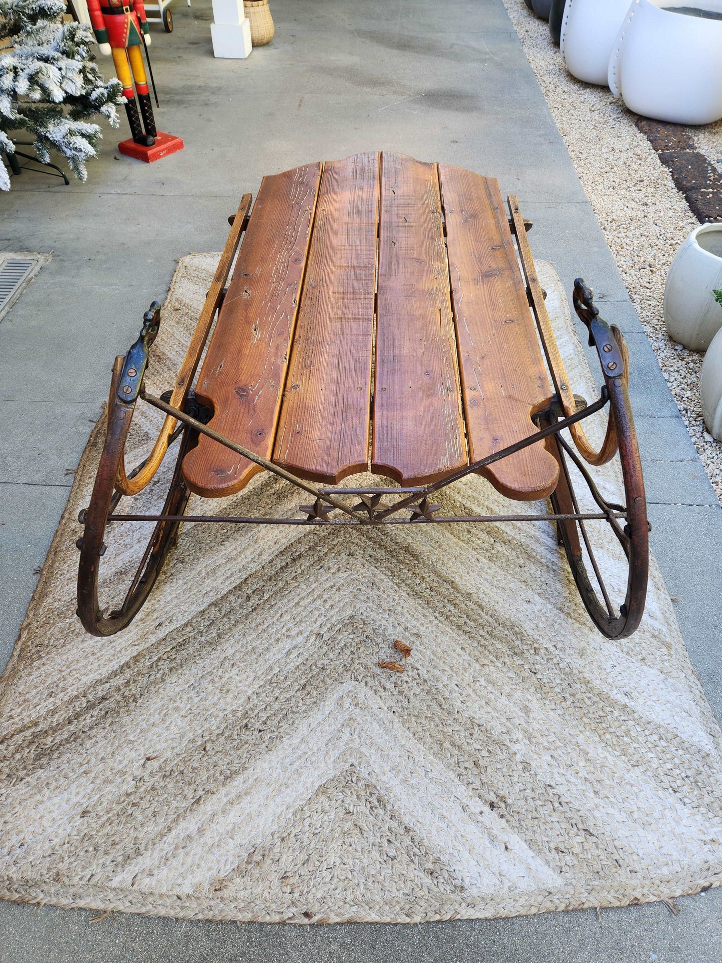 Crafted with antique pine and featuring exquisite swan head detail, this vintage sleigh boasts sturdy iron runners and measures 57" in length, 33" in width, and 28" in height.