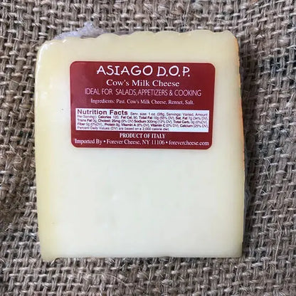 ##0##This popular cheese, also known as Asiago Aged, is from the Asiago plateau in the Veneto region and was originally made with sheep's milk, but the recipe changed as cattle farming increased in the 1500s. The DOP was established in 1979 to protect the integrity of this traditional mountain cheese, which can be made only in the provinces of Vicenza, Trento, Padova and Treviso. There are two main types Asiago: d’Allevo and Pressato. The d’Allevo version is the more traditional of the two. Once the partially skimmed milk is heated and coagulated, it is placed in special wooden molds, brined, and then aged for several months. Our mezzano (medium-aged) version develops a pleasant, yeasty aroma, compact texture and more savory flavor following 5 months of aging.