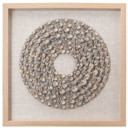 A revolving pattern of unique shell shapes create a circular pattern of organic beauty. Natural colors and textures of radiate outward while drawing you into this stunner from the sea. As if this wall art piece washed ashore, specifically for your wall.