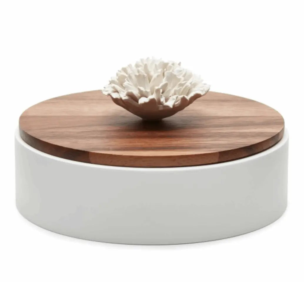 This Box Diffuser Nami XL from France combines natural Acacia wood and white lacquered wood for a decorative touch. The lid features a porcelain carnation flower on natural wood, while the round shape and 20 cm diameter make it perfect for use as a jewelry box, pocket-holder, candy box, or storage box. Add 3 drops of essential oil or perfume to the porcelain flower to transform your box into a diffuser. (Tip: To protect the wood, use a cloth when applying perfume to the flower.) Dimensions are 20 cm x 20 cm.