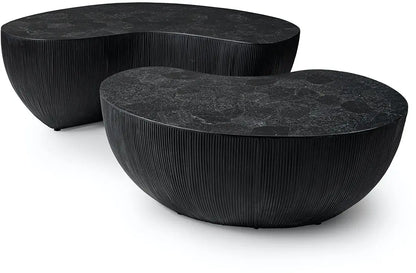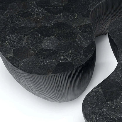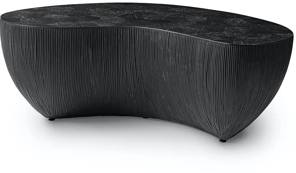 Table is cast from a hand-carved mold with a black reeded stonecast texture and fiberglass body featuring a black inlaid stone top that is entirely suitable for outdoor use. Stone is a natural material that may vary in color and grain. The table coordinates with the smaller version of this design and is also available in white agate. Dimensions: 50" length, 32" width, 18.25" height. Please allow up to 4 weeks for shipping, as lead times are subject to change. This product is final sale and is not eligible for refunds or returns.