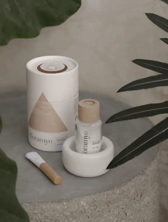 The facial ritual contains Floramye’s Celestial Dew powder—to activate it, just add water—plus a jade bowl and brush for mixing. Throughout history, jade has been gifted to seal bonds, express gratitude, and bring peace and luck. It’s used as part of the mask ritual for an ongoing reminder of the connection between Earth and spirit.