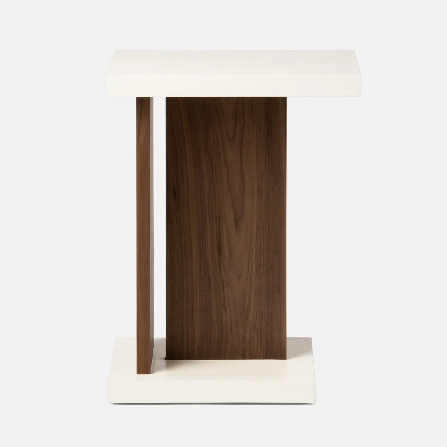 The contemporary Corvin accent table has a warm-colored, textured raffia top and base with contrasting wood grain-patterned panels. Finish: Castor Gray Faux Raffia with Walnut veneer, Pristine Faux Raffia with Walnut Veneer. Dimensiosn: 18" Length X 14" Width X 24" Height.