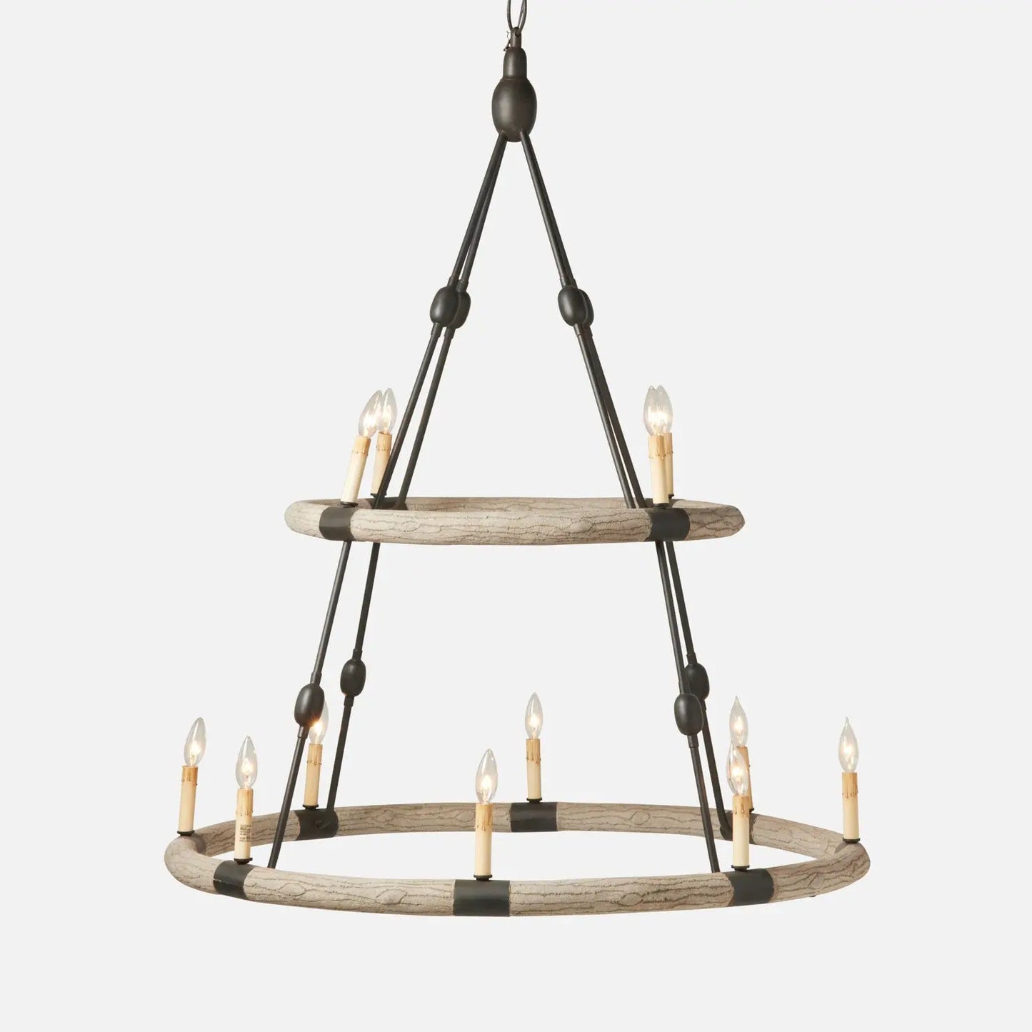 A faux bois circle is the support for six chandelier lights anchored to a natural iron base. Iron also creates a decorative support. A classic chandelier!