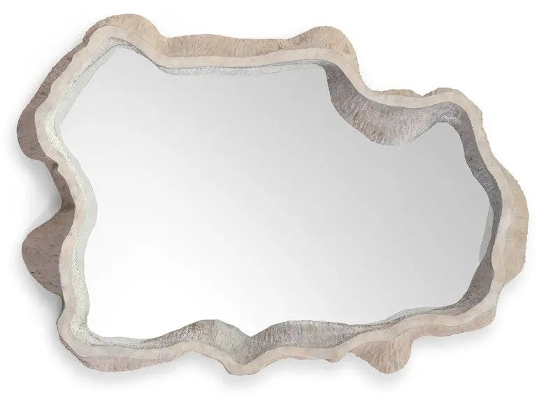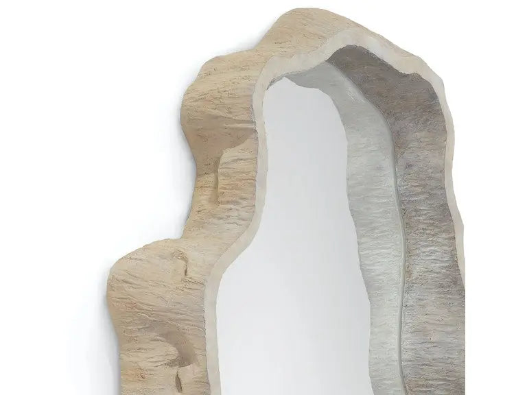 The Denali Mirror Large is made with a stonecast frame molded from a natural tree trunk for a distinctive and genuine look. It is carefully hand-painted, enhancing the mirror's appearance. This versatile piece comes with metal cleats for effortless vertical or horizontal installation and boasts dimensions of 42.5"W x 5"D x 29.5"H, with a mirror size of 34"W x 22"H. Please allow up to 4 weeks for shipping, as lead times may vary. This item is a final sale and is not eligible for refunds or returns.