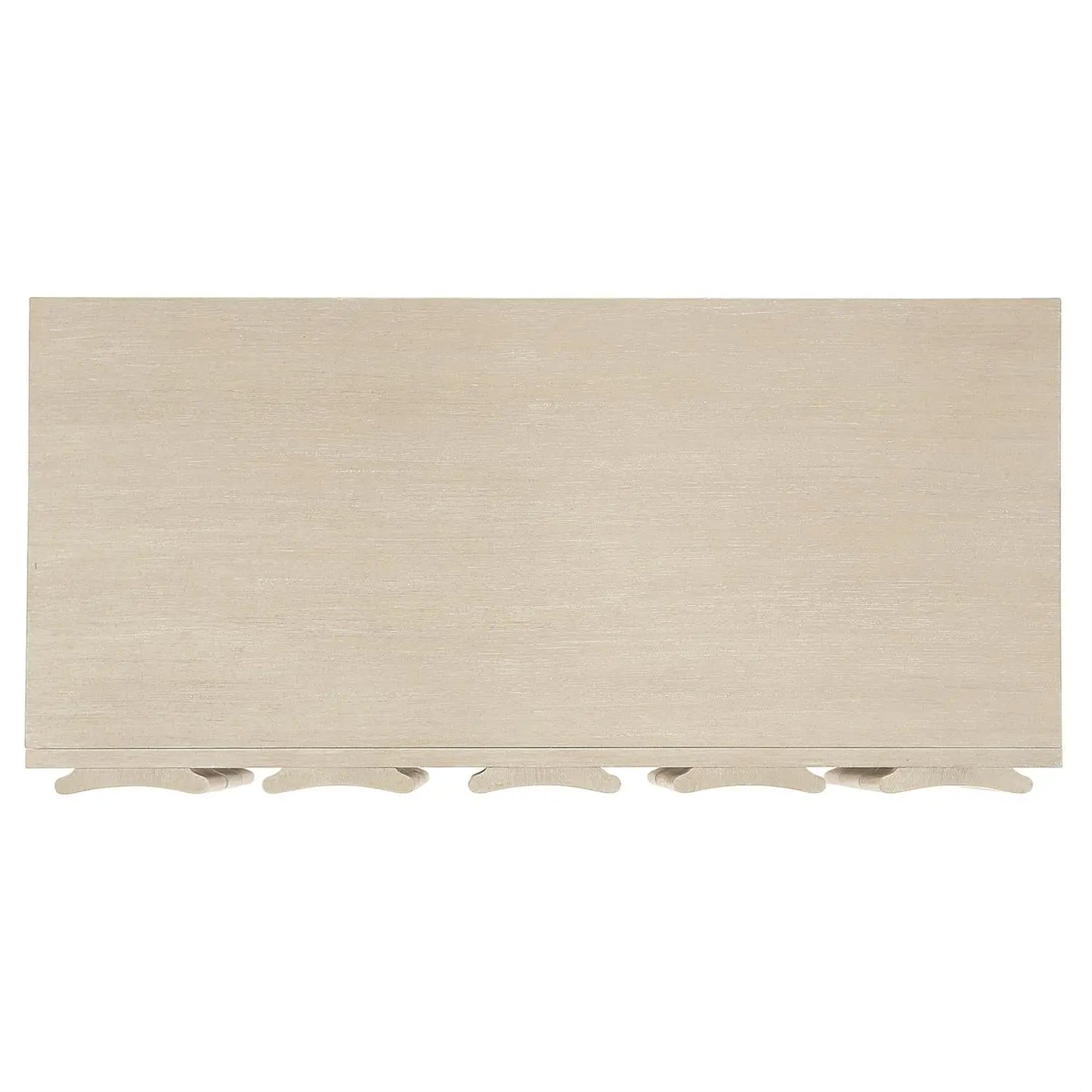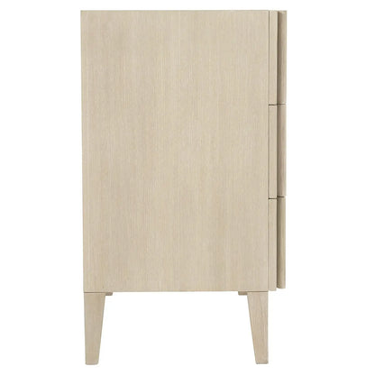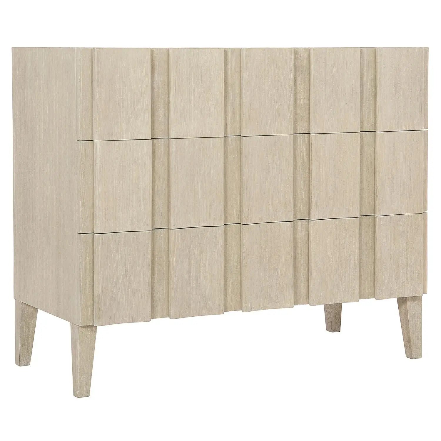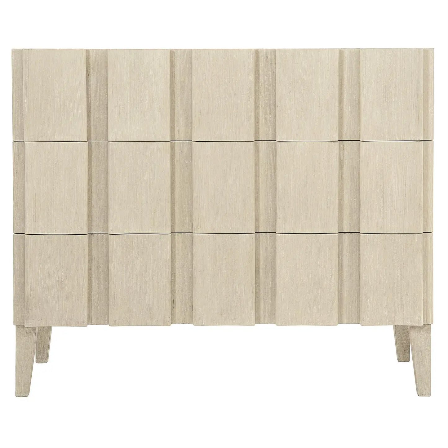 The three-drawer East Hampton hall chest features shaped vertical overlays, adding depth and dimension to the minimalist design. Quartered ash veneers are presented in a Cerused Linen finish, created using light wire brushing and cerusing techniques to highlight the linear wood grain. The soft finish blends with the subtle curvature of the overlays to create a look that is slightly feminine. Slender tapered feet contribute to the clean, modern aesthetic. Ash solids and veneers in Cerused Linen finish. Three drawers with shaped vertical overlays. Adjustable glides. Anti-tip kit.