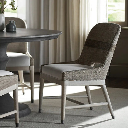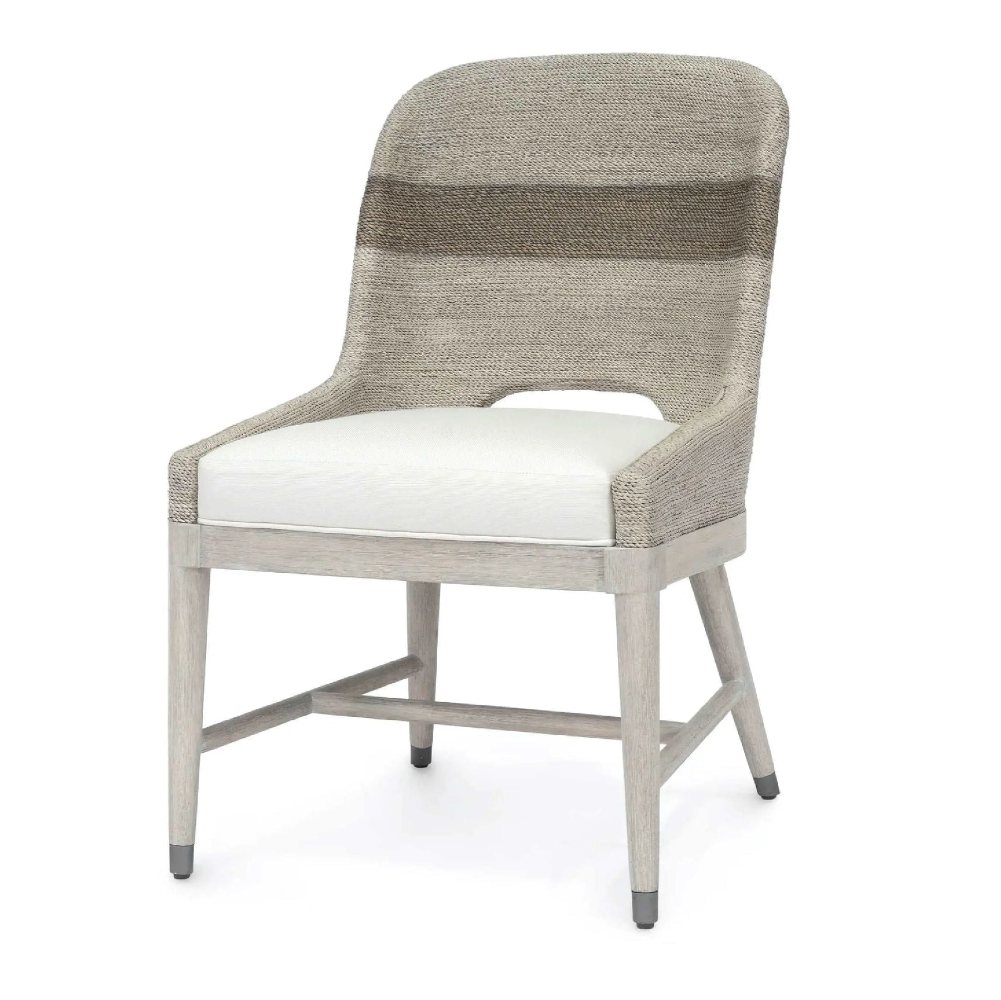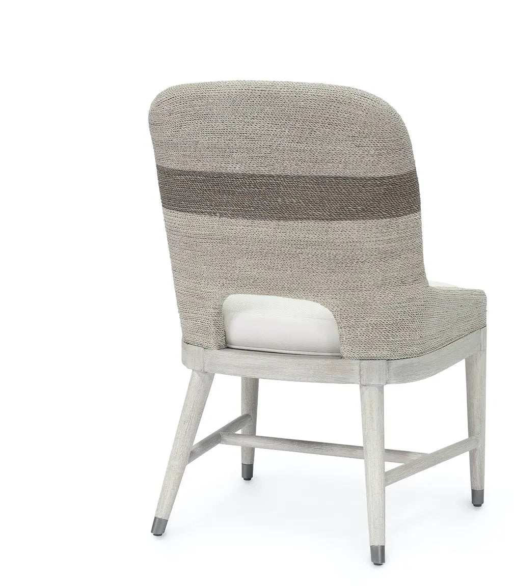 The Fritz Side Rope Chair features a hardwood frame and legs in whitewash with a pewter finish on the foot caps. The double wall back and sides, along with the hand-twisted lampakanai rope in a fog white finish with taupe stripe, add a touch of elegance to the chair. The fixed upholstered seat coordinates with the Fritz Rope white fog collection. With overall dimensions of 22"w x 25"dp x 34", this chair is both stylish and comfortable. Please allow 4 weeks for shipping, as lead times may change. No refunds or returns are available.
