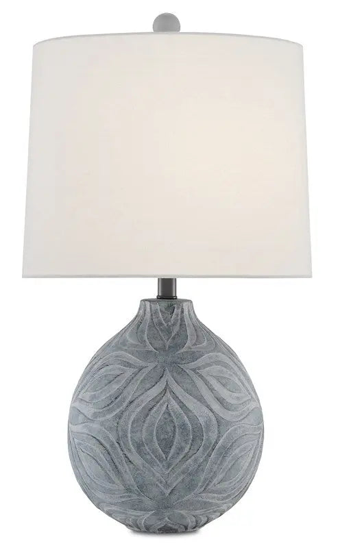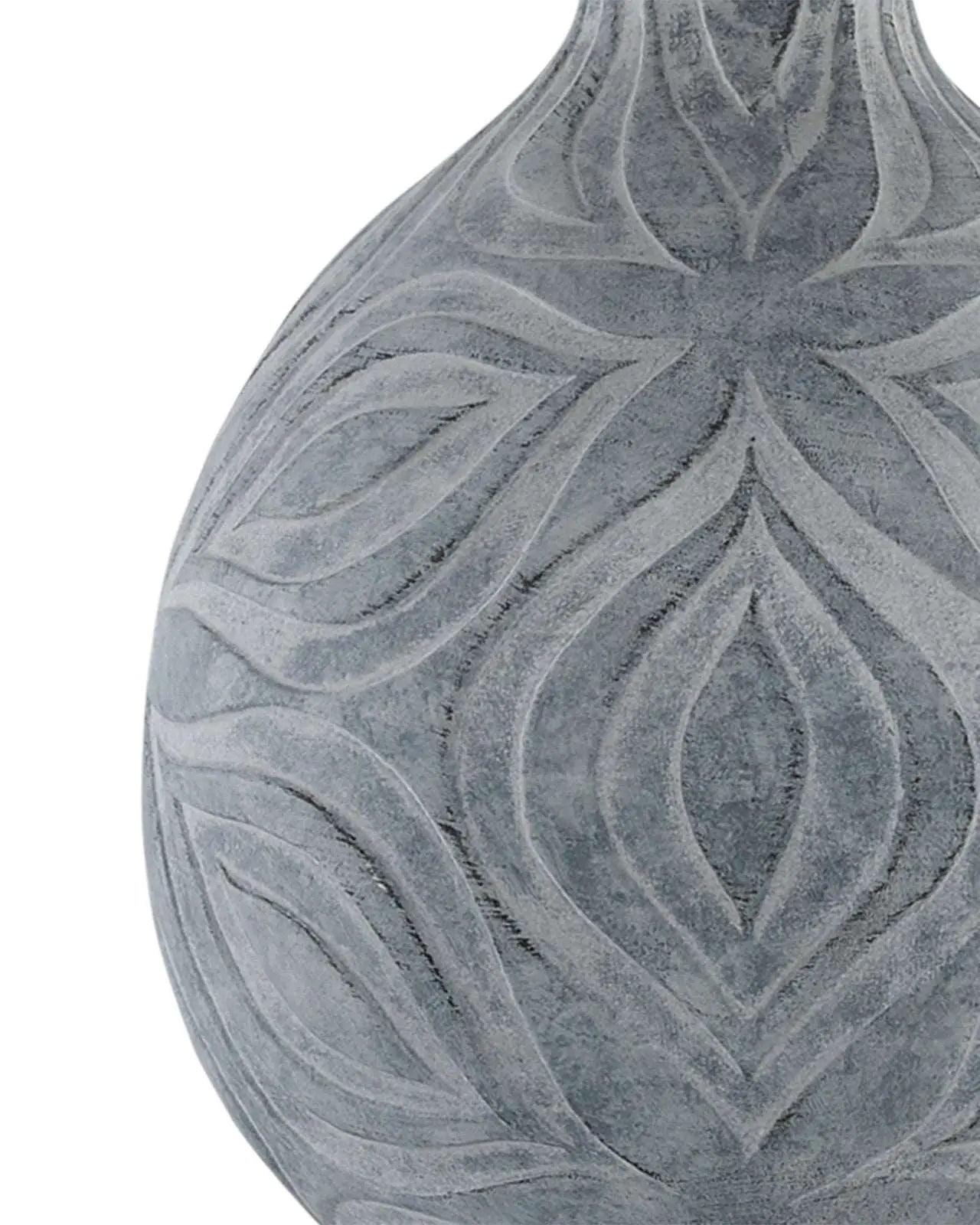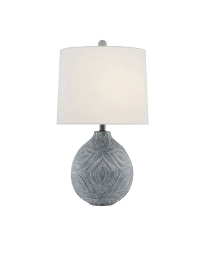 Hadi Table Lamp The Hadi Table Lamp is made of ceramic into which patterns have been carved, then given a matte softness with a gray wash. The gray table lamp has an ethnic ... Shade Dimensions: 12" x 14" x 15" Body: 12"h x 10.5"dia Materials: Ceramic Cord: 8' Silver Weight: 11lbs Illuminate your space with the Hadi Table Lamp, crafted from ceramic and adorned with intricate carvings. The matte gray finish gives a touch of softness while adding an ethnic flair to your decor. The perfect addition to any room, this lamp boasts a sturdy ceramic body, measuring 12"h x 10.5"dia and a shade that measures 12" x 14" x 15". With an 8' silver cord and weighing 11lbs, it's both functional and stylish.