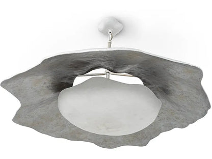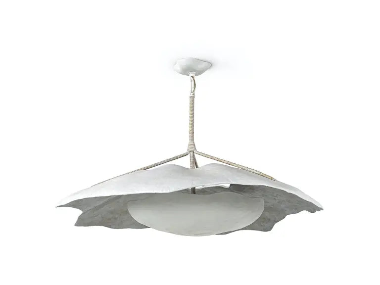 Fully adjustable chandelier features cast fiberglass in a white textured finish with a pewter and gold finished underside. Accented with hand-wrapped split rattan in a whitewash finish over powder coated metal poles. Chandelier is complete with a metal hanging canopy kit and includes 1 x 18" rod, 1 x 12" rod, 1 x 6" rod and 1 x 3.75" rod for customizable hanging heights. Professional installation is recommended. Coordinates with the Lima collection. 42.5"w x 42"dp x 14.25"h