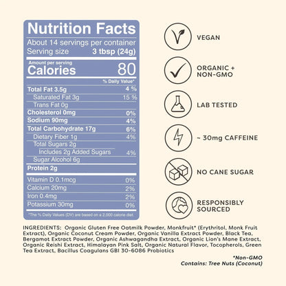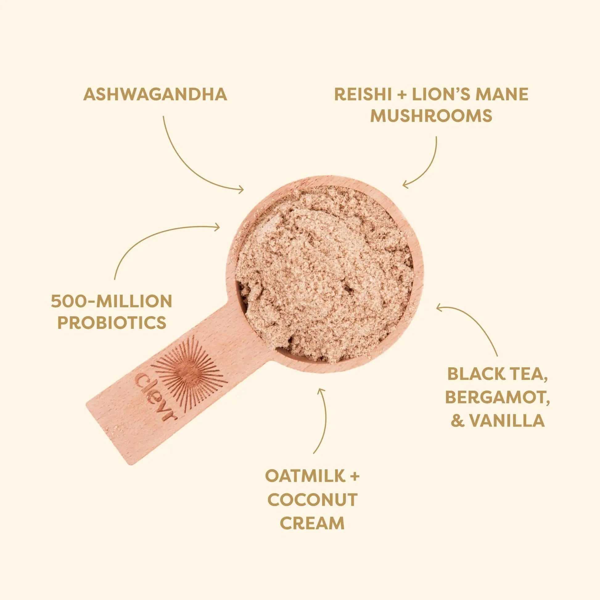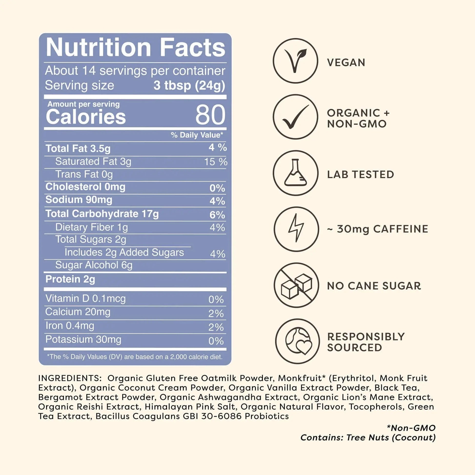 Curl up with our NEW luxurious London Fog, steaming with sweet Indonesian vanilla and real Italian bergamot oil. In West Coast fashion, we boosted this oatmilk earl gray with adaptogens, probiotics, and the perfect microdose of caffeine for gentle energy and quintessential coziness.
