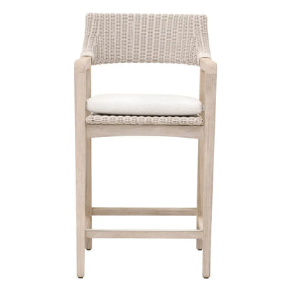 The Lucia Outdoor Counter Stool features a solid teak wood finish known as "Gray Teak", which has been treated to achieve a natural silver tone. As it ages, this teak will develop a unique color and texture, and may show marks and cracks. By choosing Gray Teak, you acknowledge and accept these characteristics, and agree not to make any claims regarding its natural aging process or special color qualities. It is important to take good care of this natural finish. Finish: Pure White Synthetic Wicker, Performance White Speckle, Gray Teak. Dimensions: W:21.5" D:21" H:39.75" Weight: 21lbs Woven Back & Seat Design High Performance, Durable Fabric Removable Seat Cushion Solid Teak Wood Frame Suitable for Indoor and Outdoor Use L-Shaped Metal Footrest Cover Please allow 4 weeks for shipping, as lead times may change. Refunds and returns are not available.