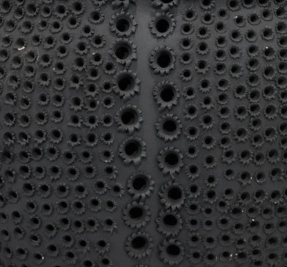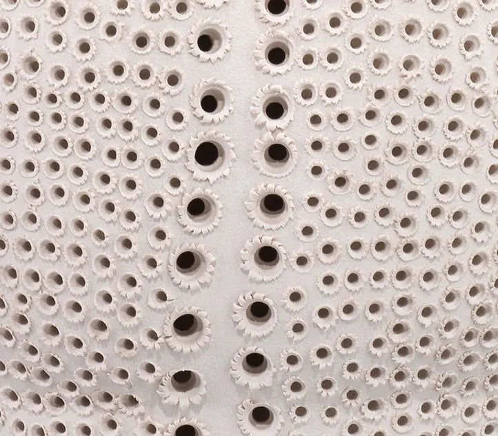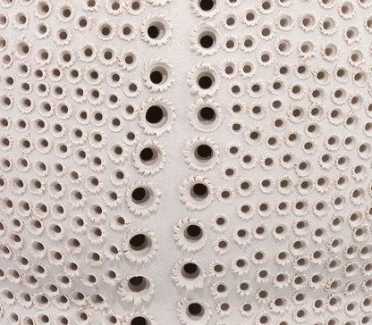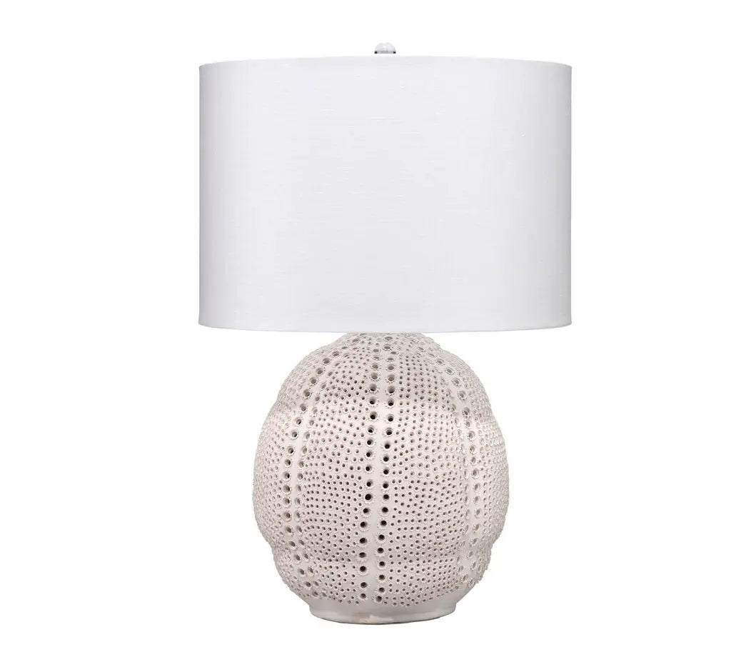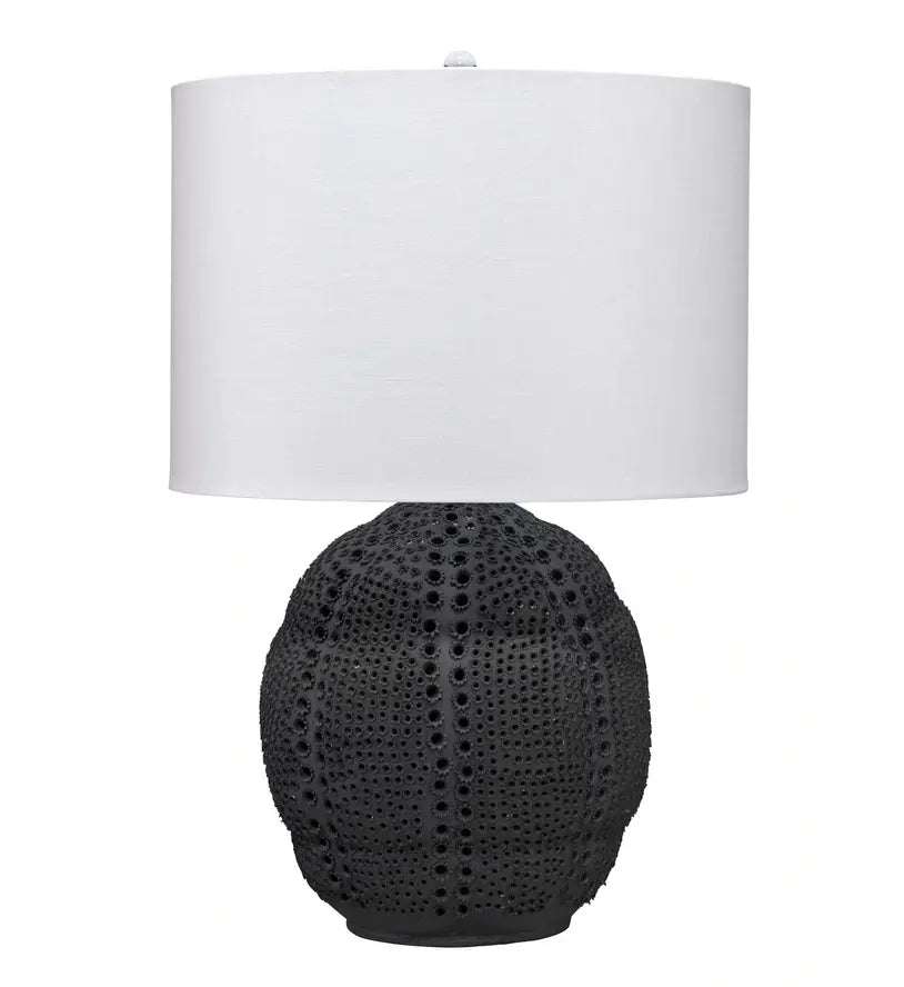 The perforated patterns on the curved and dimpled base of this table lamp reflect Jaime’s interpretation of the craters, mountains, and seas of the lunar landscape. While the design’s celestial inspirations are subtle, the look is not! The bold and decorative patterns are created one-at-a-time by talented artisans. Each lamp is topped with a linen rolled-edge drum shade in white and an acrylic ball finial; the sockets and 3-way turn knobs are silver. The Lunar lamp is available in your choice of Matte Black or Matte Lunar lamp is available in your choice of Matte Black or Matte White. No two will be identical.