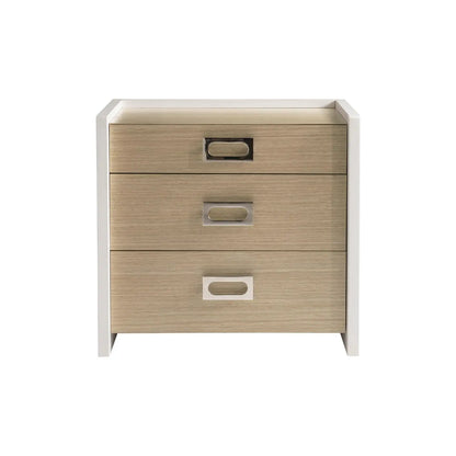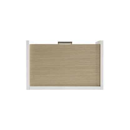 The Modulum nightstand, with its design inspired by midcentury modern styles, boasts an elegant Sahara finish and a center case that floats between white Adobe side panels. Accentuating its sophisticated appearance is a gallery rail finished in Adobe. The nightstand also features a recessed bank of three soft-close drawers, equipped with metal hardware that boasts a retro design. Additionally, a two-port USB charger is conveniently located on the back of the nightstand. Crafted with faux stone on the end panels and gallery in Adobe finish, and engineered wood veneer on the top surface and drawers in Sahara finish, this nightstand is both stylish and functional. It also comes with an adjustable glides, anti-tip kit, and instruction sheet. Measuring 26 inches in width and 18.50 inches in depth, with a height of 27.50 inches, this nightstand is the perfect addition to any bedroom. Please expect a lead time of 4 weeks for shipping. Refunds and returns are not available.