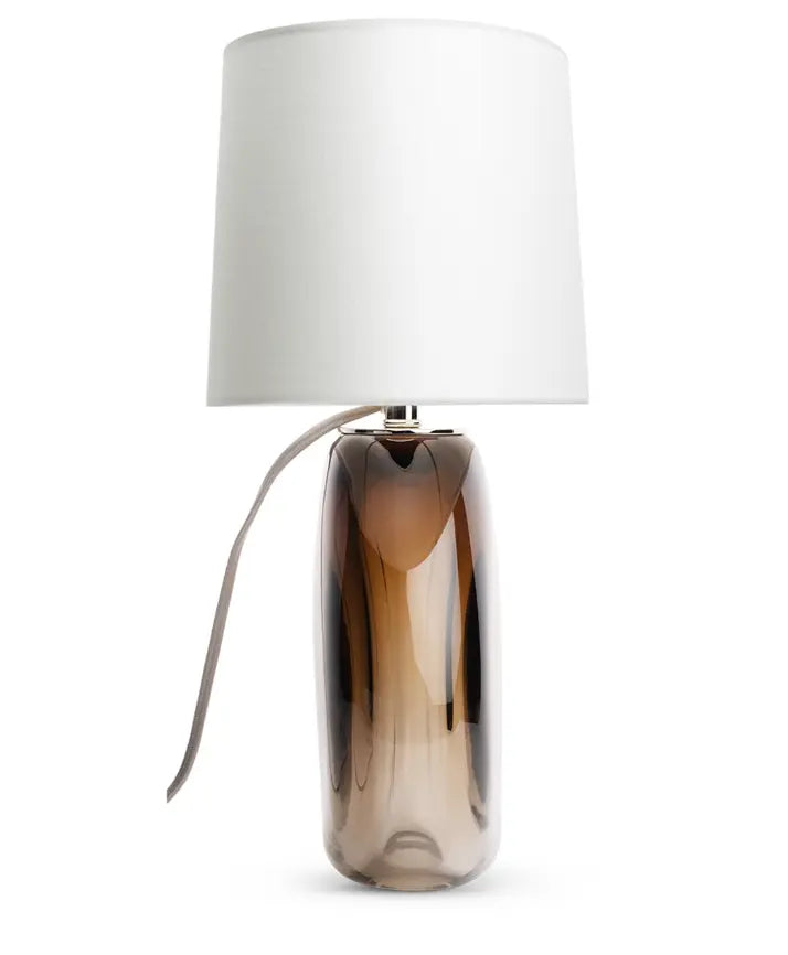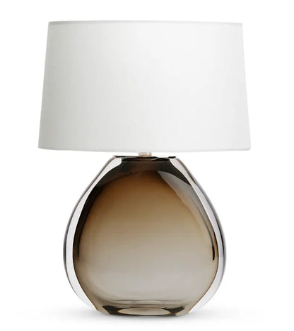 HEIGHT: 17.25″HFINISH: glass, beigeSHADE: oval; 11.5″W(t) x 7″D(t) x 12.5″W(b) x 8″D(b) x 7.5″HSOCKET: 60W 1-wayWEIGHT: 12 lbsNOTE: cloth cord comes out of socket, on/off switch on cordThis striking handcrafted glass table lamp delivers a unique aesthetic thanks to its bold oval profile and polished nickel finish. The smokey beige brown glass base poses an intriguing contrast to the sophisticated off-white linen lampshade. Design note: The cloth cord comes out of the socket. Expertly handcrafted, the Orio Table Lamp boasts a commanding 17.25" height and polished nickel finish. The striking oval profile of the lamp, crafted from smokey beige brown glass, creates an eye-catching contrast to the off-white linen lampshade. A functional and stylish addition to any space, the lamp features a 60W 1-way socket and a convenient on/off switch on the cloth cord.
