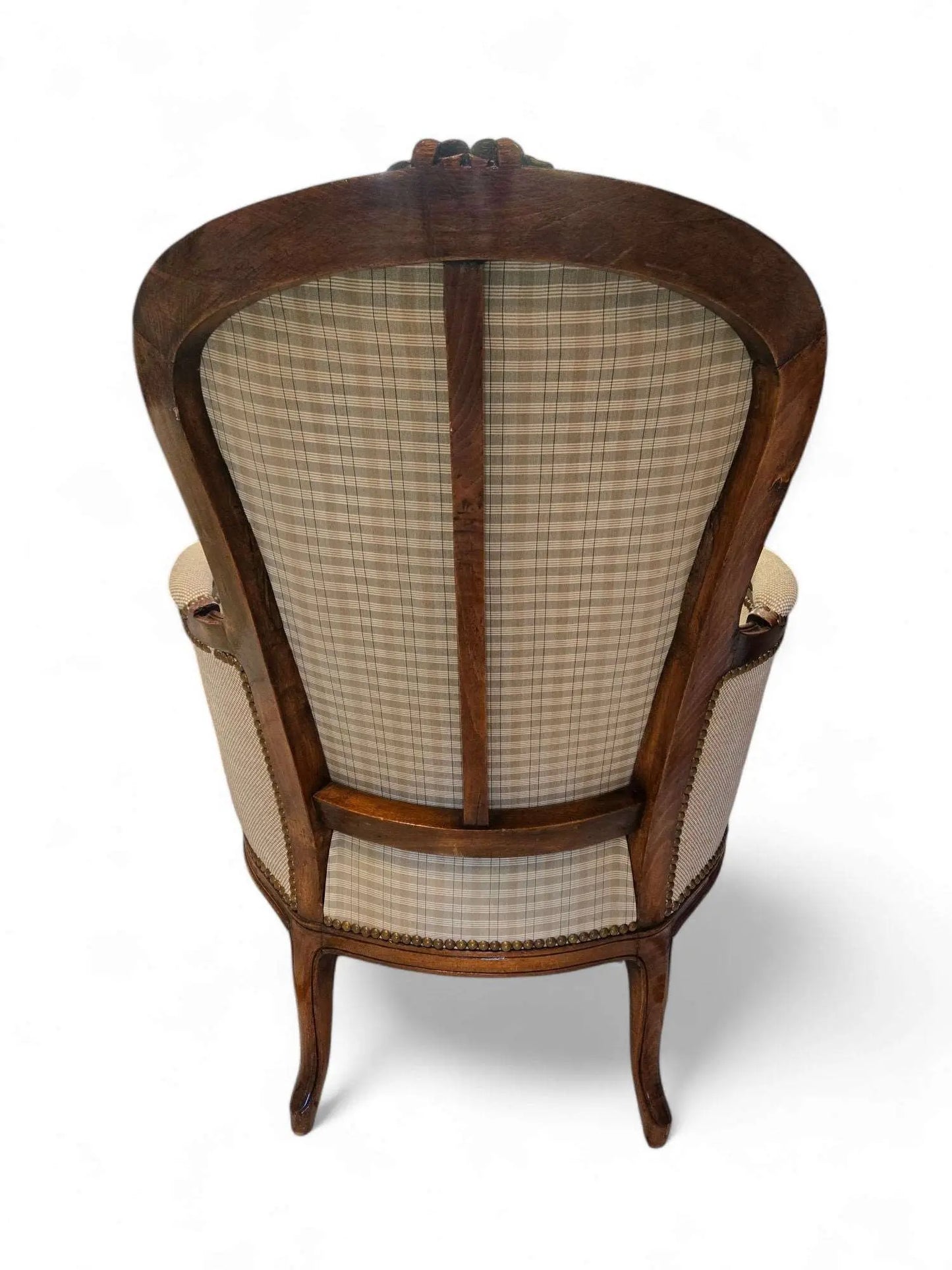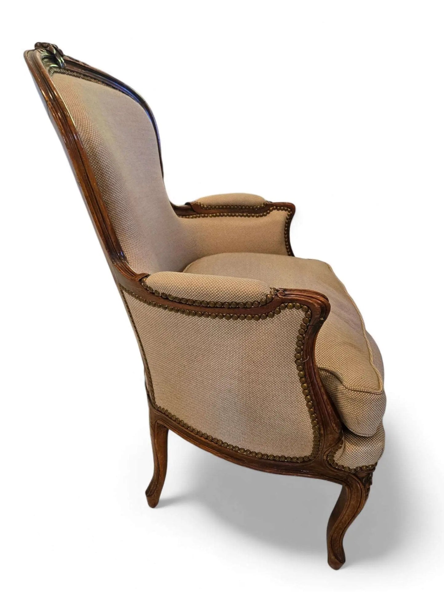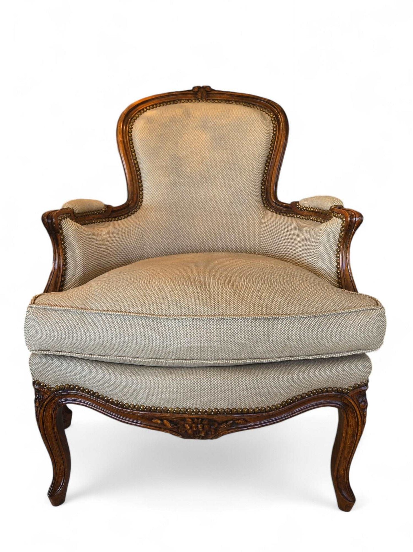 This demure pair of Louis XV-style walnut bergère armchairs date from the 18th century, beautifully constructed with a shapely 'cabriolet' back for comfort. The frames are intricately carved and sculpted, with floral flourishes at the crest and at the center of the ornately curved apron. The armrests are generous and padded, featuring attractive scroll designs on their corners, which echo the carvings on the cabriole legs. The chairs are upholstered in a tan and camel nailhead fabric, with the cusion verso and back in a lovely tight plaid cotton, secured all round with a nailhead trim. Each chair is completed with a generous and lofted down wrapped removable seat cushion.