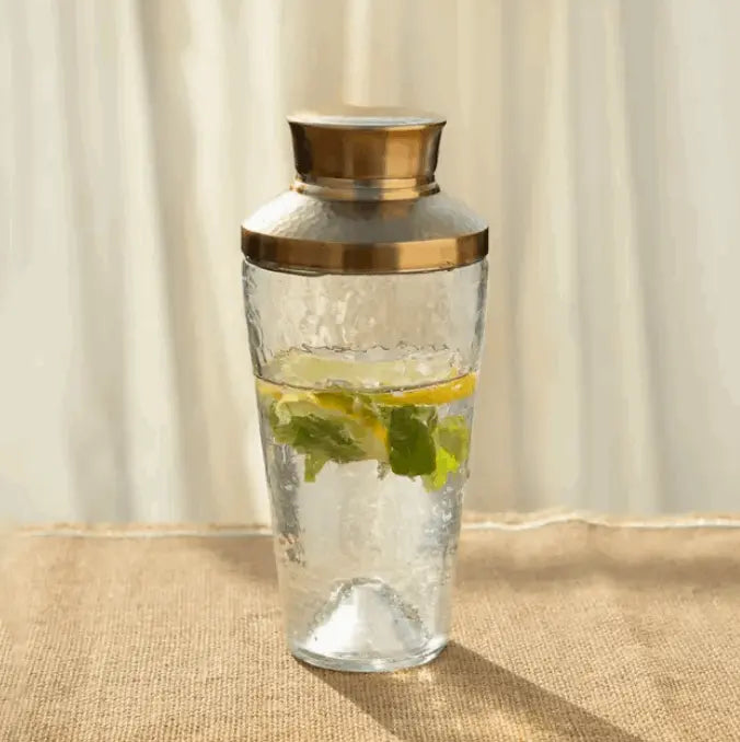Elevate your mixology game with our stylish Pebbled Glass cocktail shaker, featuring a hammered, brass-like stainless steel lid crowning a lightly dimpled glass body. The vessel is handcrafted from partially recycled glass, giving it a slightly greenish hue. This punt-bottomed shaker makes a fabulous gift for outfitting a home bar with essential tools and coordinates nicely with our popular Pebbled Glassware.
