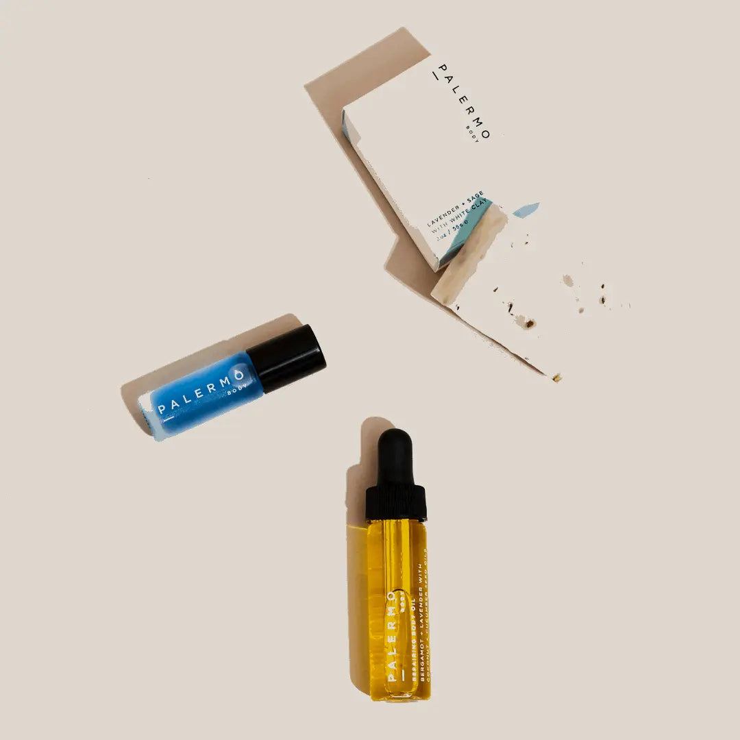 - .5 oz Repairing Body Oil: A soothing body oil blend scented with bergamot and lavender. Formulated to hydrate and repair sun-damaged skin.