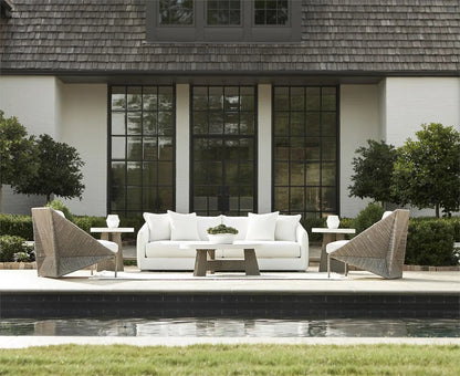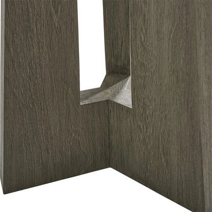 The Rochelle outdoor side table boasts a distinctive base with three intersecting open-work triangles. This creates a sense of lightness while the glass-reinforced concrete top provides a smooth Quarry finish. The Weathered Teak finish on the teak base complements the tabletop beautifully. The base has three leg panels, open at the center where they meet, and comes with stainless steel adjustable glides. A protective cover is available for an additional fee. The dimensions are 24 inches for width, depth, and height. Please allow up to 4 weeks for shipping, as lead times may change. This product is final sale and cannot be returned or refunded.