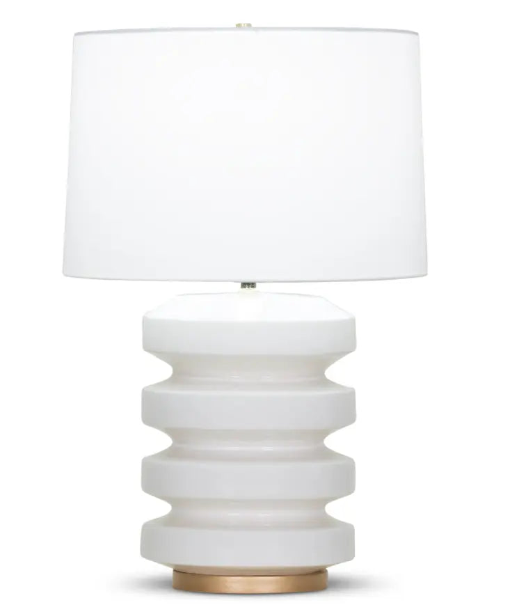 A sculptural ceramic table lamp wears an Off-White finish for a versatile modern statement. The contrasting slim gold base acts as a bright pedestal for the body, while an Off-White cotton tapered drum shade tops the look. Place this neutral lamp anywhere illumination is needed.