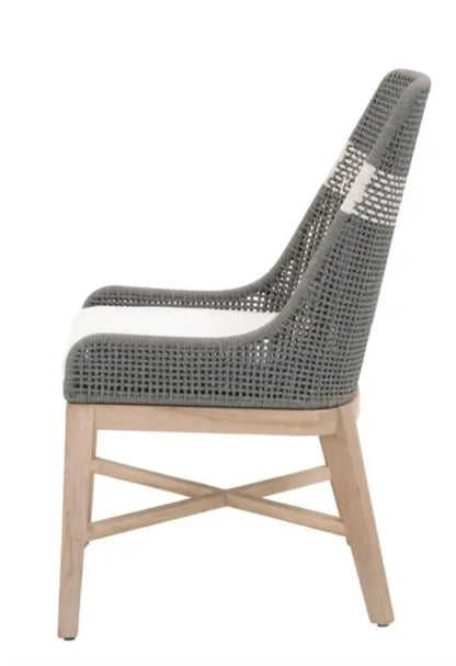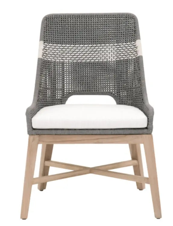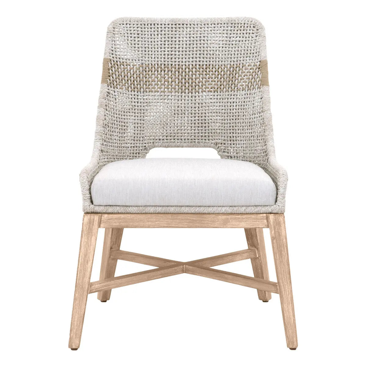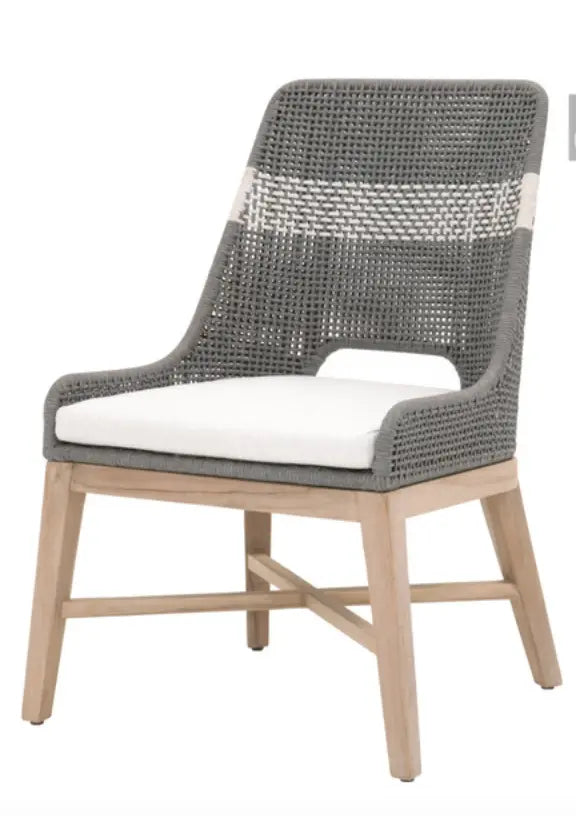 This product features a combination of Dove Flat Rope, White Speckle Stripe, White Speckle, Gray Teak and Taupe & White Flat Rope, Taupe Stripe, Performance Pumice, Natural Gray Mahogany materials, including Solid Teak Wood, Powder Coated Steel, Polyolefin Rope, 100% Olefin Fabric, and Foam. The seat has a height of 18.5", width of 19", and depth of 19", while the arm height is 19" and the back width is 18.5". Overall, the chair measures 24.75" in width, 23.5" in depth, and 34.5" in height. The seat cushion has a thickness of 2" and the chair itself weighs 23lbs. Please note that shipping may take up to 4 weeks and refunds/returns are not available.