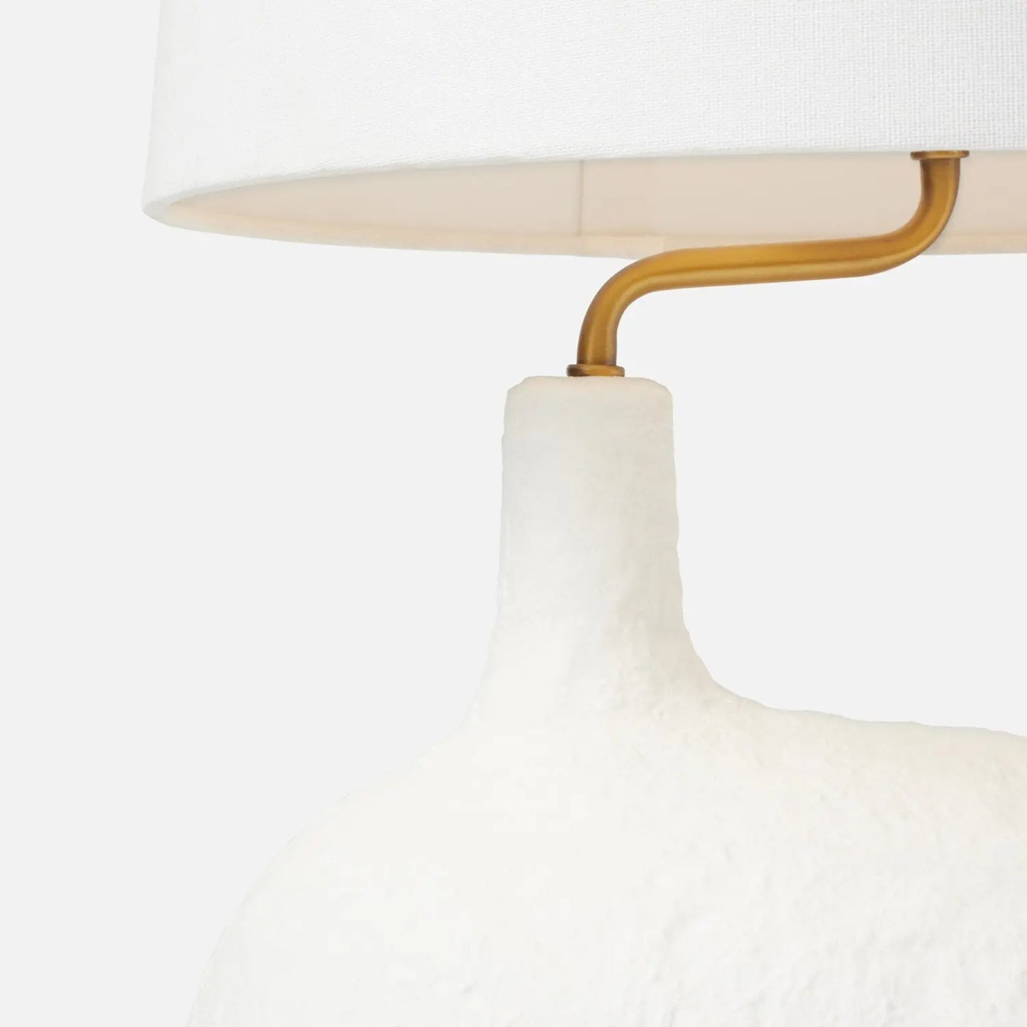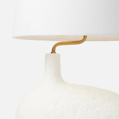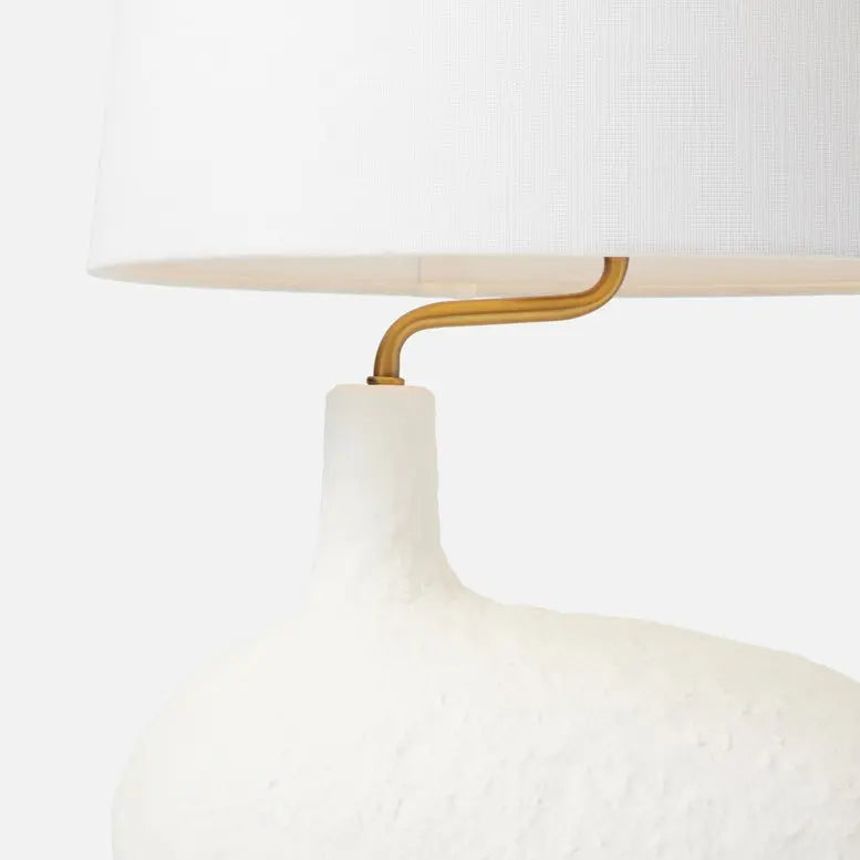 Our small Tober table lamp has a base shaped like a textured pebble, and a neck that is askew yet offers a perfectly centered shade. It's a trick of the eye that quietly invites a hint of surrealism into any space. Finish: Matte White Resin. Dimensions: 12" Diameter, 20" Height.
