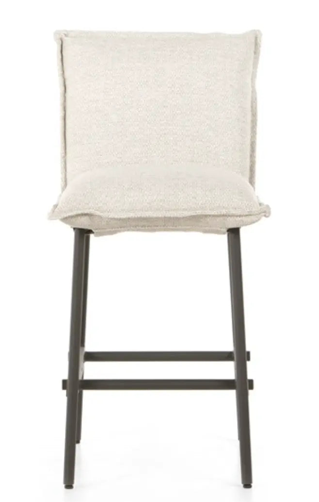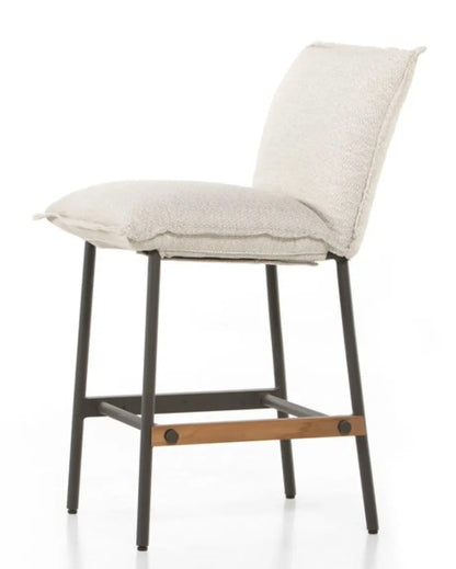 A plush take on outdoor entertaining. Durable sand-colored upholstery features flange detailing, for a luxuriously comfy sit with fresh flair. An airy, dark bronze-finished iron base with teak-detailed stretchers mixes materials to beautifully modern effect. Cover or store indoors during inclement weather and when not in use.