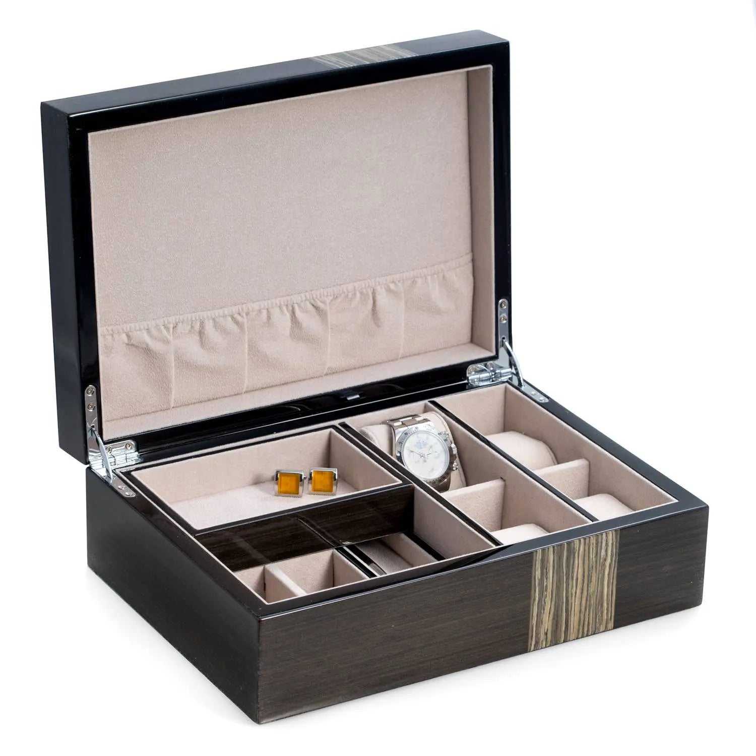 Lacquered "Ash" wood valet box with multi compartments for storage, 4 watch pillows, and removable valet tray. Dimensions: 11.75 x 8.5 x 4. Weight: 4.6. Product features: 7 layer lacquer finish, multi sections, watch pillows, 4 watch pillows, soft velour lined. Colors: ash wood. Model # BB677GRY