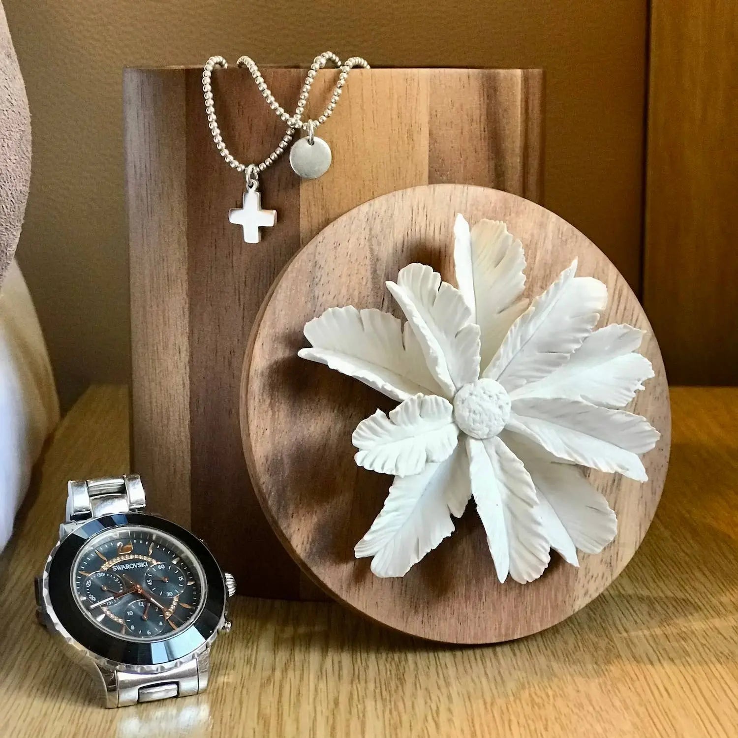 High box in acacia wood with lid surmounted by a palm flower in porcelain Cylindrical shape. Tip: Place 3 drops of essential oil or perfume on the porcelain flower and your box turns into a perfume diffuser! (tip: protect the wood with a cloth when you put the perfume on the flower). This product is available in 3 sizes.. This one is the biggest one. Its versatility makes it an ideal Christmas gift for your holiday season. This product will make a perfect Christmas decoration