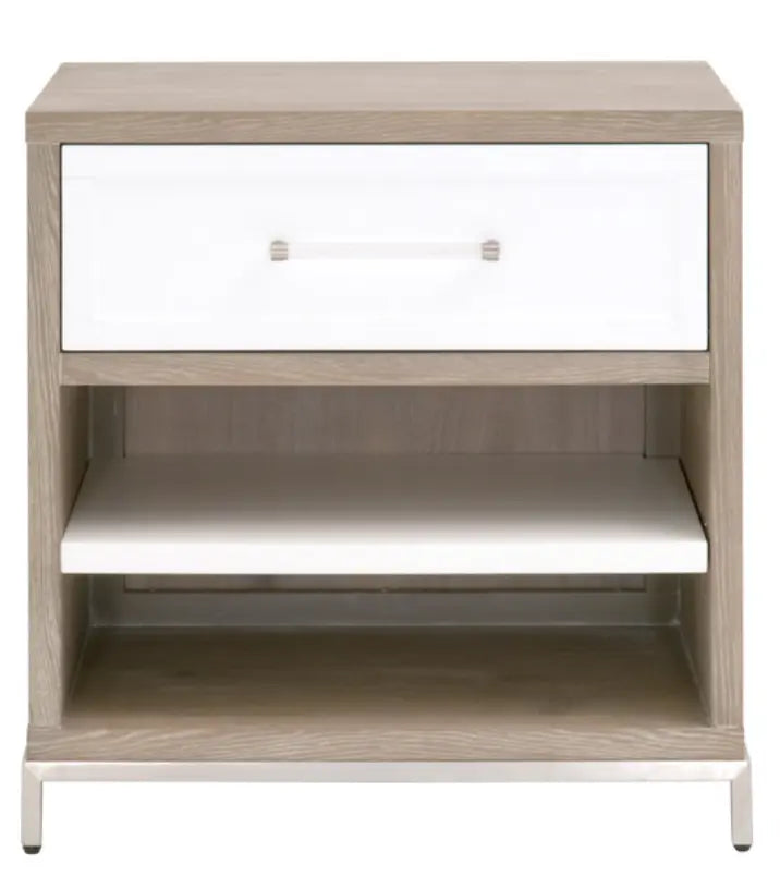 Enhance your bedroom with the Wrenn 1-Drawer Nightstand. Featuring contrasting colors and decorative hardware, this transitional style nightstand is the perfect addition to your decor. The full extension metal glides and adjustable shelf offer practical storage solutions. With dimensions of 27.5"w x 17.75"d x 28.5"h, it is a perfect fit for any room. Please allow 4 weeks for shipping. No refunds or returns available. Elevate your bedroom today!